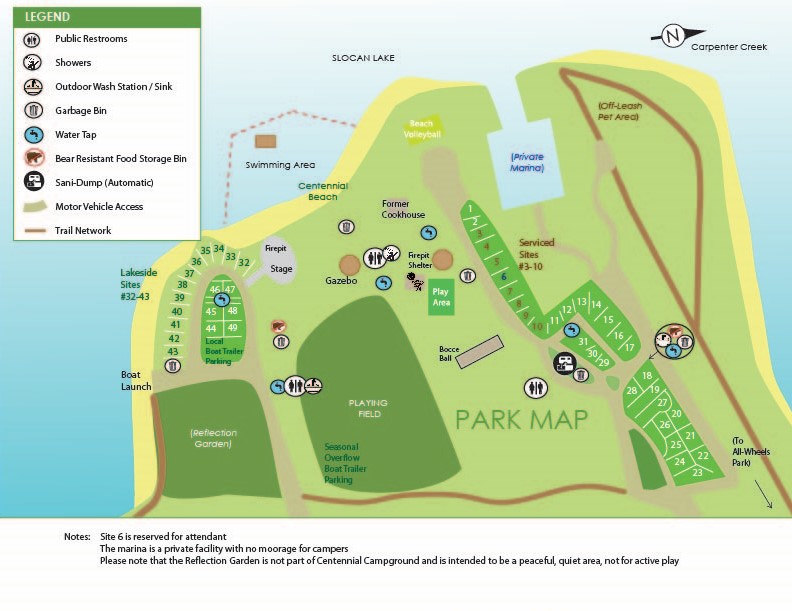 - Reservations are permitted on all numbered sites (except site 6, which is reserved for the attendant).