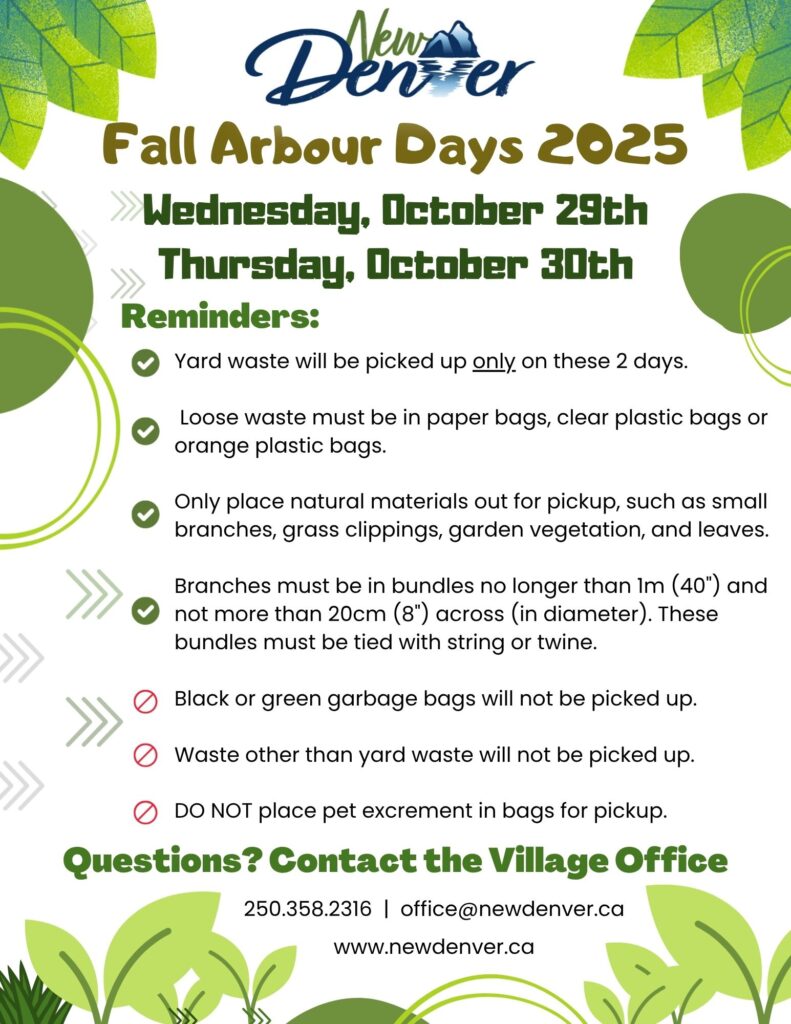 The Village of New Denver will be collecting on October 29th and October 30th only. Please follow the guidelines below: